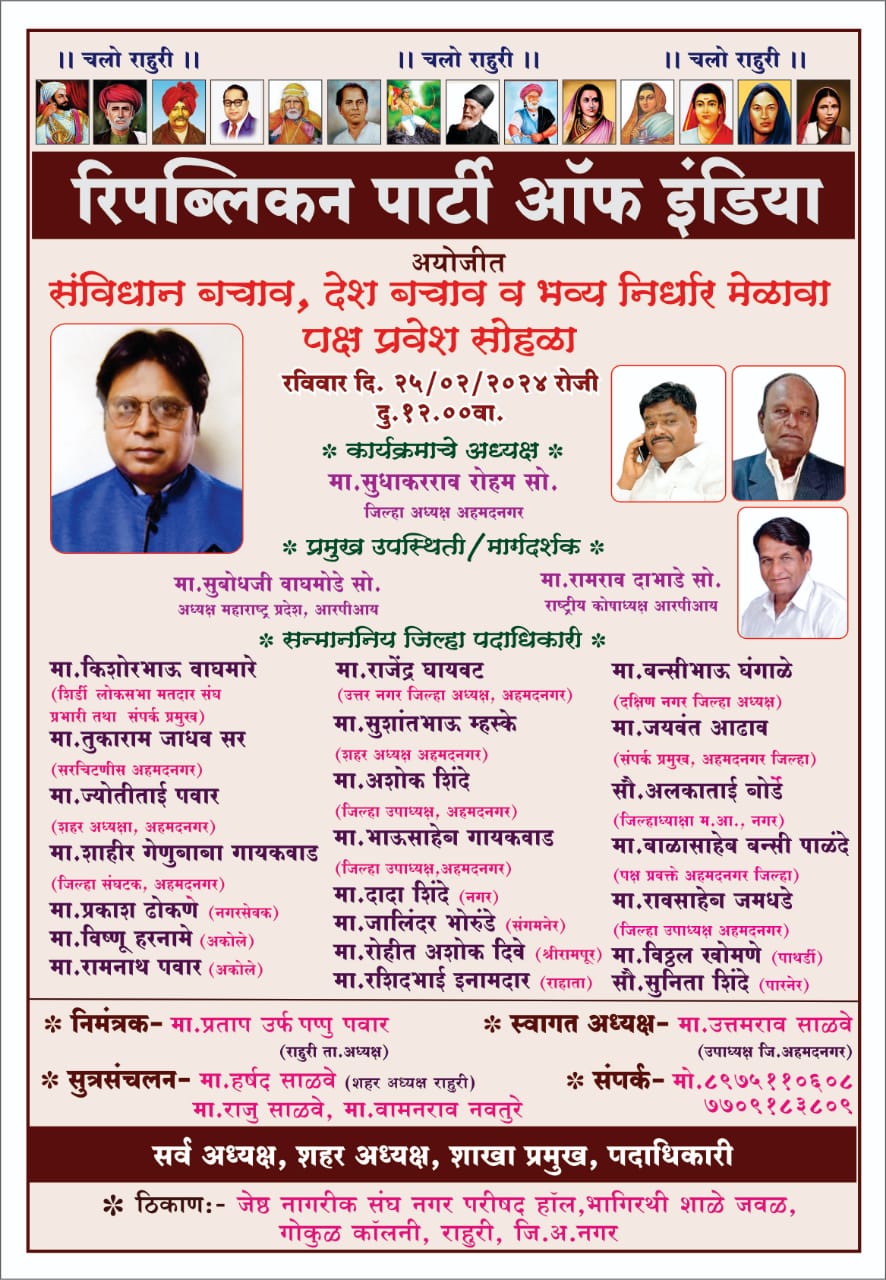 रिपब्लिकन पार्टी ऑफ इंडिया गवई पक्षाच्यावतीने पक्षाचे राष्ट्रीय नेते डॉ राजेंद्र गवई यांच्या आदेशानुसार लोकसभा निवडणुकीच्या पार्श्वभूमीवर राहुरी येथे पक्षाच्यावतीने आज दि २५ मार्च २०२४ रोजी भव्य निर्धार मेळावा व संविधान भाषा व देश बचाव कार्यक्रमाचे आयोजन केले असल्याची माहिती अहमदनगर जिल्हा उपाध्यक्ष उत्तमराव साळवे यांनी दिली आहे