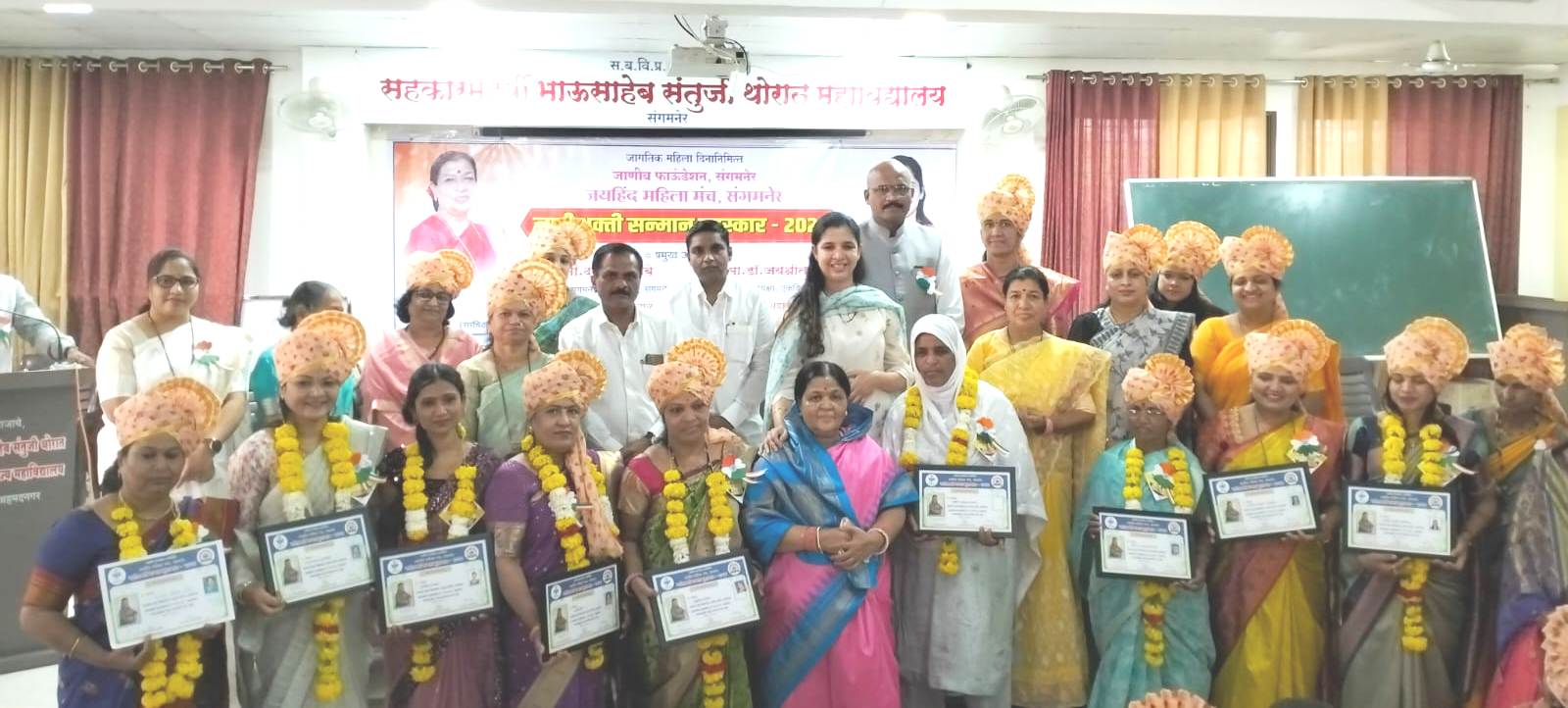 सौ ताराबाई वामन, वर्षा भोंडे, योगिता कडव ,सुप्रिया गायकर ,सौ लताताई मुर्तडक, जुलेखा शेख ,सौ संगीता बाळासाहेब देशमाने, सौ ताराबाई अशोक हजारे ,सौ प्रमिला रमेश खेमनर ,सौ शारदा गोरख करपे, सौ कविता सूर्यवंशी पवार, ऋतुजा मानकर, सिंधू गायकवाड, कमल काकडे ,ज्योती दारोळे ,नाजनीम शेख, जमुना राक्षे, अनारबाई कन्हैयालाल कतारी, रेखा पंजाबी, मंदा पाटोळे, सौदामिनी कानोरे, नूर जहा तांबोळी,सौ प्रमिला रामनाथ अभंग ,कल्पना देवेंद्र ओहरा, छाया दिघे, राणीताई वाजे, आशा वाकचौरे, ॲड शुभांगी घुले, डॉ अर्चना गोरे, उषा क्षीरसागर, सुशीला पाटणकर, शुभदा मुळे, सुजाता सांगळे, सोनाली गायकवाड ,वैशाली आडेप ,सुनिता पापडेजा ,निर्मला टोकसे, स्मिता गुने, रूपाली तिवारी, फातिमा मोमीन, सीमा चौबे, आसावरी मुळे, शोभा कोळपकर, जयश्री काळंग, चंद्रकला भोईर, जागृती कळसकर, रजनी पाथरकर, सुरेखा दुधे ,नम्रता नितीन ओझा, सुनीता वावळ ,उज्वला कलंत्री, राधाबाई गोसावी, पार्वतीबाई पवार, अशालता पारख, योगिता शिंदे, संगीता खरात, शीला वाकचौरे, पार्वतीबाई होलम या साठ महिलांना सन्मानचिन्ह शाल बुके व प्रशस्तीपत्र देऊन गौरविण्यात आले.