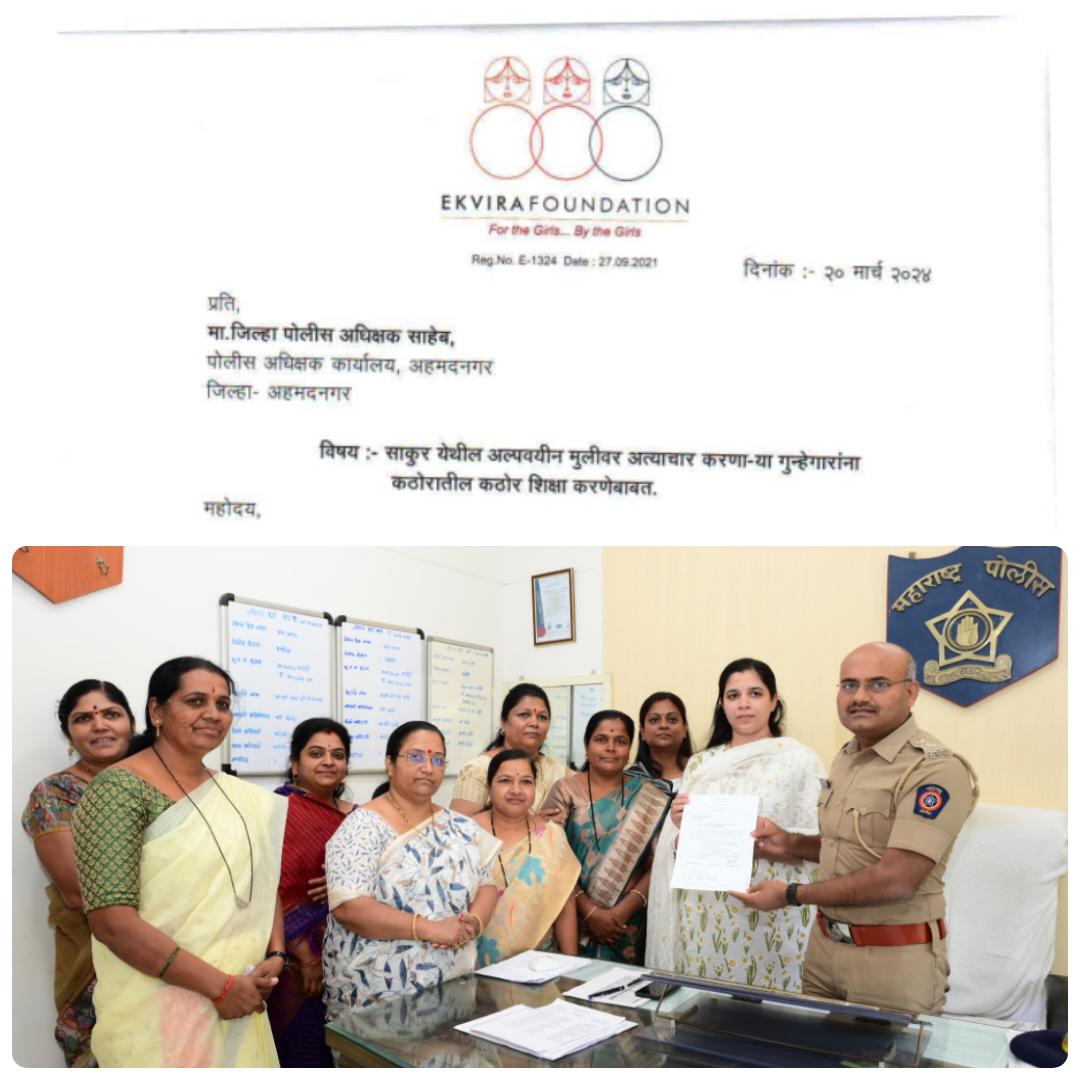 याचबरोबर या अल्पवयीन मुलीच्या कुटुंबीयांना शासनाकडून संरक्षण मिळावे व तसेच त्यांना मनोधैर्य योजनेअंतर्गत मदत मिळावी अशी मागणी या निवेदनात करण्यात आली असून यावर संगमनेर शहराच्या नगराध्यक्ष सौ दुर्गाताई तांबे आणि एकविरा फाउंडेशनच्या अध्यक्ष डॉ. जयश्रीताई थोरात व जयहिंद महिला मंच आणि एकविरा फाउंडेशनच्या विविध महिला भगिनींच्या सह्या आहेत.