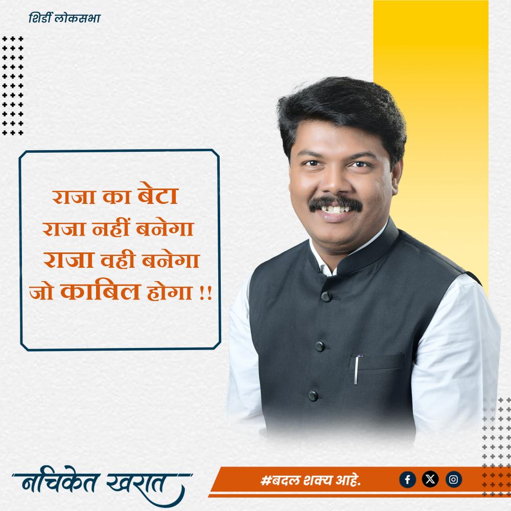 तेव्हा मतदार बंधूनो मी श्री. नचिकेत रघुनाथ खरात आपणास नम्र आवाहन करत आहे की, मी BSW, MSW असा उच्चशिक्षित तरुण असून मी आपल्या शिर्डी मतदार संघासाठी अनेक विकासात्मक, विधायक कामे करण्याचा माझा मानस आहे. मा. आजी माजी खासदार महोदयांएवढी