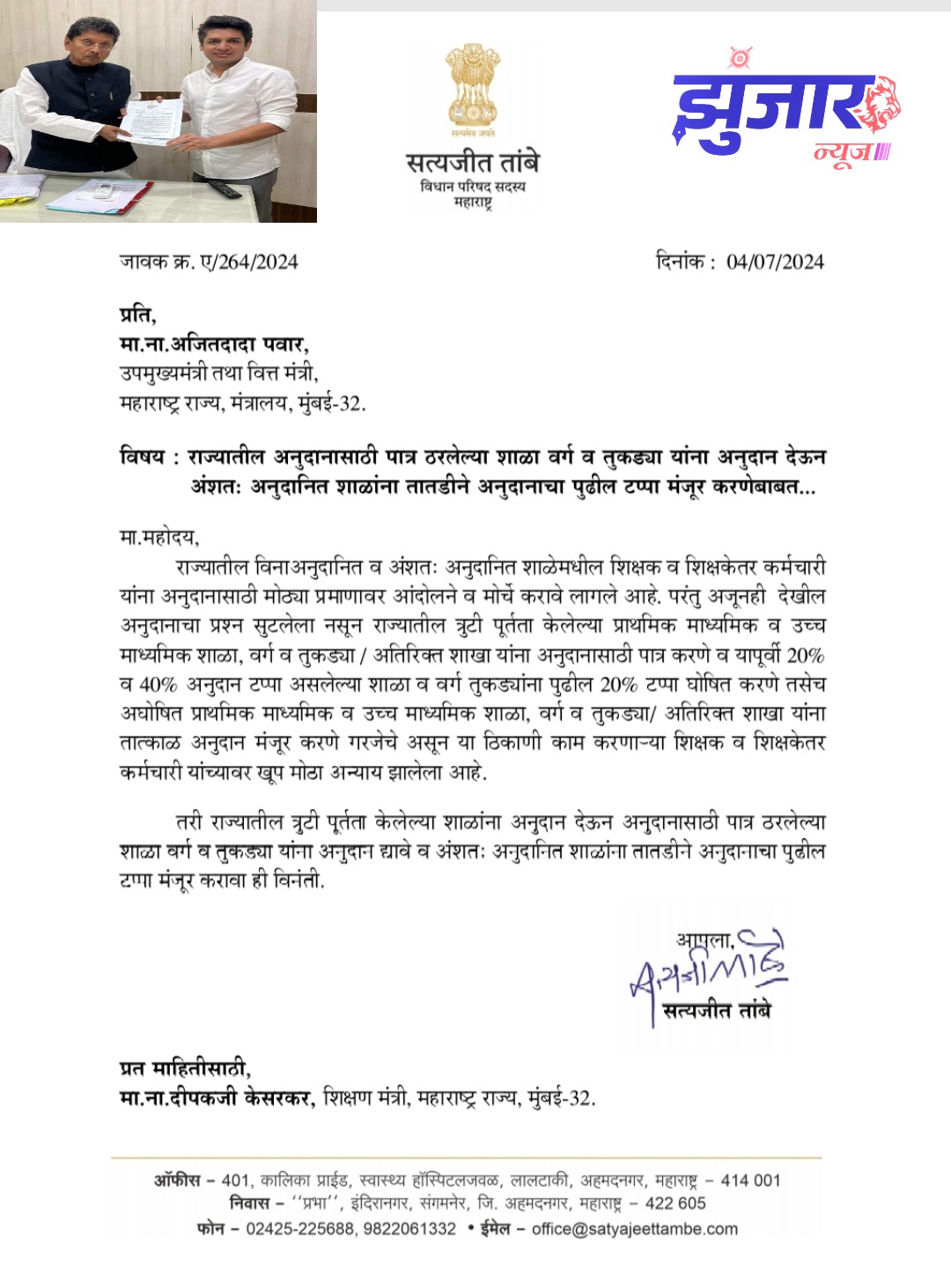 राज्यातील विनाअनुदानित व अंशतः अनुदानित शाळेमधील शिक्षक व शिक्षकेतर कर्मचारी यांना अनुदानासाठी मोठ्या प्रमाणावर आंदोलने व मोर्चे करावे लागत आहेत. परंतु अजूनही अनुदानाचा प्रश्न सुटलेला नाही. राज्यातील त्रुटी पूर्तता केलेल्या प्राथमिक, माध्यमिक व उच्च माध्यमिक शाळांना अनुदानासाठी पात्र करावे. तसेच यापूर्वी २०% व ४०% अनुदान टप्पा असलेल्या शाळा व वर्ग तुकड्यांना पुढील २०% टप्पा घोषित करावा. अघोषित प्राथमिक, माध्यमिक व उच्च माध्यमिक शाळांना तात्काळ अनुदान मंजूर करणे गरजेचे असून या ठिकाणी काम करणाऱ्या शिक्षक व शिक्षकेतर कर्मचारी यांच्यावर खूप मोठा अन्याय झाल्याचे आ. सत्यजीत तांबे यांनी म्हंटले आहे.