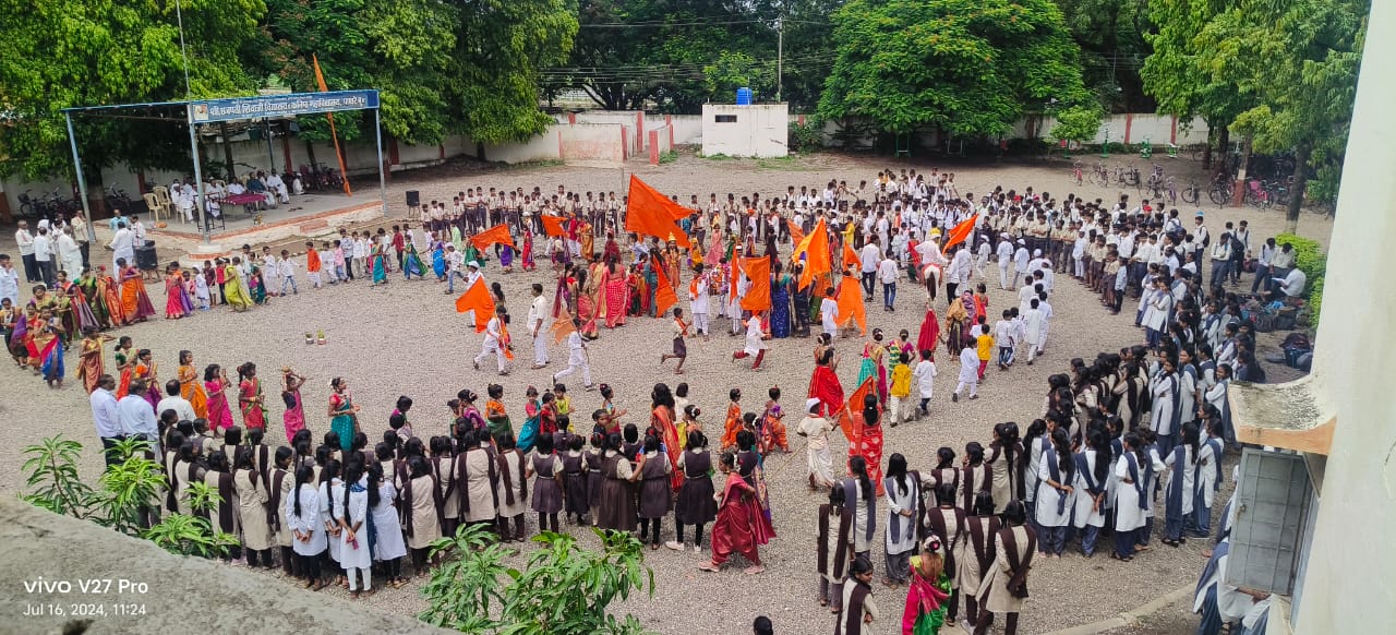 या दिंडीमध्ये सजविलेला अश्व सर्वांचे लक्ष वेधून घेत होता. या गोल रिंगणाने सर्व ग्रामस्थांचे लक्ष वेधून घेतले होते. जय जय राम कृष्ण हरी..ज्ञानोबा माऊली..संत तुकाराम आणि संत ज्ञानेश्वर महाराज यांच्या अखंड जयघोषाने दुमदुमलेले प्रांगण.. टाळ मृदुंग वाजवित हरी नामाच्या गजरात तल्लीन झालेले चिमुकले..सर्व अनुभवत होते. यावेळी वारकऱ्यांच्या वेशभूषात असलेल्या विद्यार्थ्यांच्या हातातील भगवे झेंडे तर विद्यार्थ्यांनीच्या डोक्यावर तूळशी वृंदावन होते. हे जणू आपण खरंच पंढरपूरच्या वारीमध्ये असल्याचा भास झाला.
