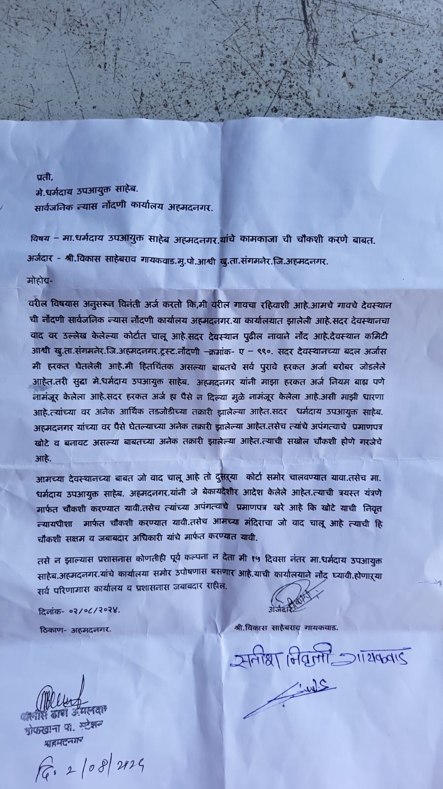 याबाबत दिलेल्या निवेदनात गायकवाड यांनी म्हटले आहे की, आश्वी खुर्द गावचे देवस्थान नोंदणी क्रमांक – ९९० चा वाद धर्मदाय उप आयुक्ता समोर सुरू आहे. याबाबत मी हरकत घेतली असून याबाबत सर्व पुरावे सादर केले आहेत. तरी सुद्धा नियमबाह्य पद्धतीने माझा हरकत अर्ज नामंजूर करण्यात आला आहे. धर्मदाय उप आयुक्त यांनी अर्थिक तडजोड करुन माझा अर्ज नामंजूर केल्याचा गंभीर आरोप गायकवाड यांनी करत उप आयुक्त यांचे अपंगत्व प्रमाणपत्र देखील खोटे व बनावट असल्याचे म्हणत चौकशीची मागणी केली आहे.