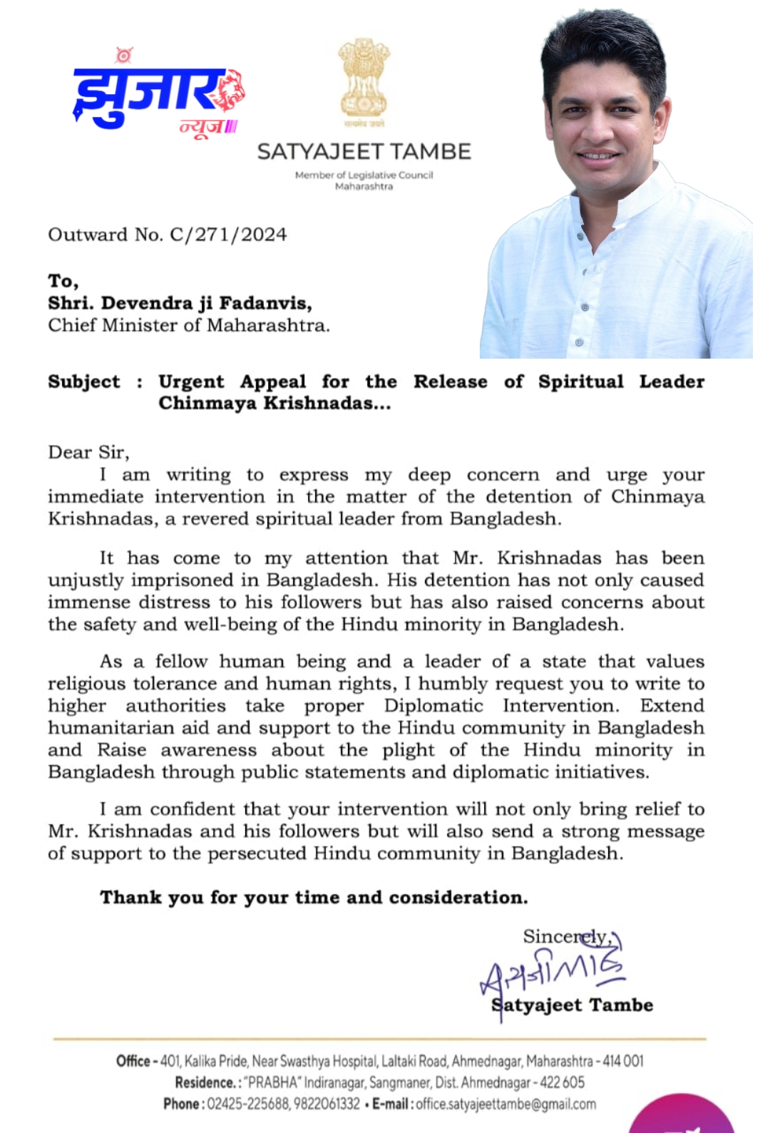 युवक आमदार सत्यजित तांबे यांनी बांगलादेश मधील हिंदूंवर होणाऱ्या अत्याचाराबाबत मुख्यमंत्री महोदयांकडे केलेल्या निवेदनात म्हटले आहे की, बांगलादेश मधील आध्यात्मिक गुरू चिन्मय कृष्णदास यांना तेथील सरकारने अत्यंत अन्यायकारक पद्धतीने अटक केली आहे. त्याचबरोबर त्यांना तुरुंगात टाकले आहे .यामुळे केवळ त्यांच्या अनुयायींना त्रास झाला नाही तर बांगलादेश मधील समस्त हिंदू बांधवांच्या सुरक्षिततेबद्दल आणि कल्याणाबाबत मोठी चिंता निर्माण झाली आहे.