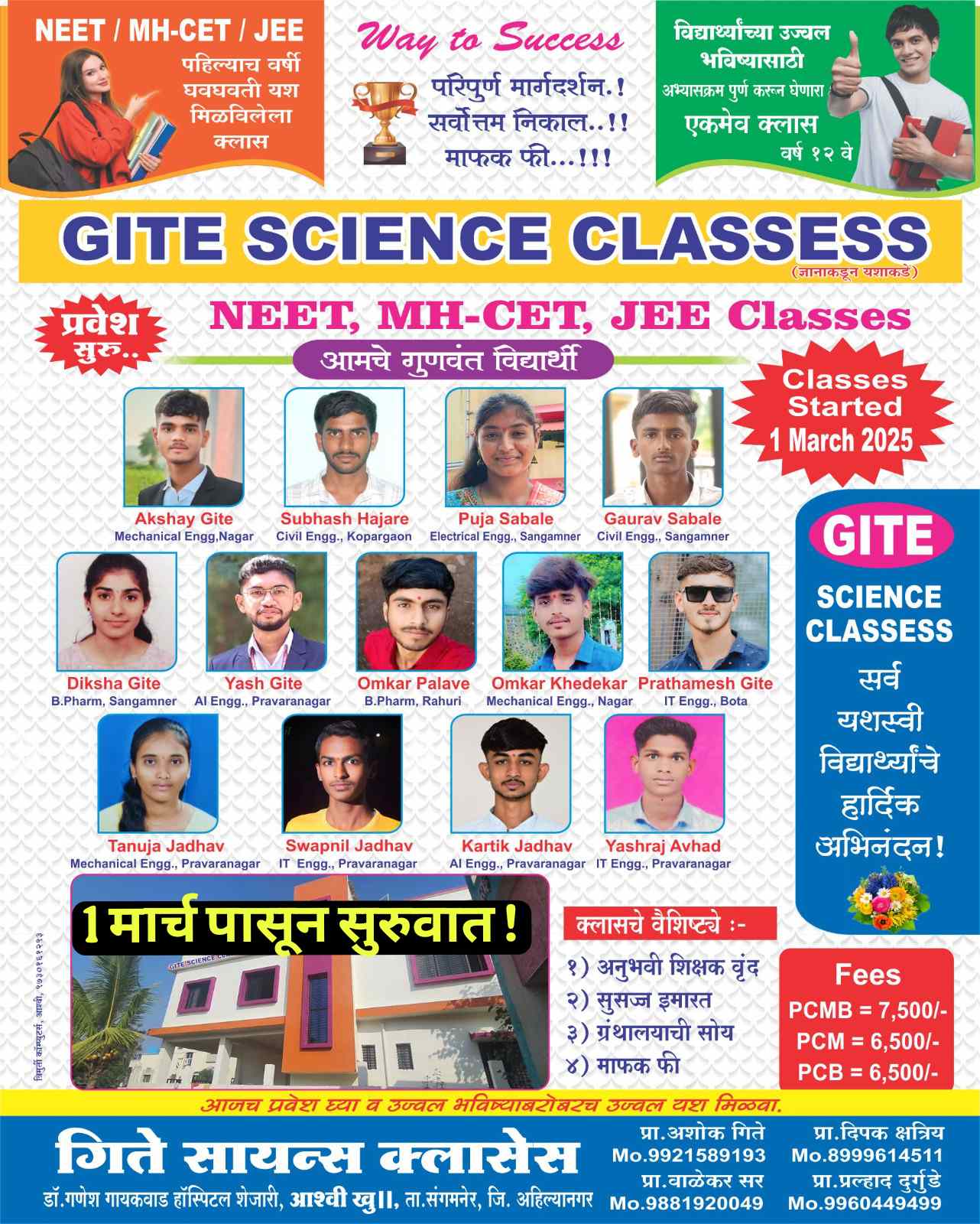 आश्वी मध्ये सर्वात उत्तम MH CET कोचिंग क्लासेसच्या शोधात आहे तर मग आता तुमची प्रतिक्षा संपली ” GITE SCI CLASS ” गेल्या 12 वर्षापासून शुरू आहे . हा सर्वात उत्तम पर्याय विदयार्थांना मिळालेला आहे . या अकादमी मधून MH CET, JEE व NEET दर्जदार , उत्कृष्ट पणे शिकविले जात आहे तसेच 11 वी 12 वी च्या विदयार्थ्याकरिता भौतिक, रसायन विज्ञान, जीव विज्ञान, गणित व इंग्रजी असे विषयावर शिकविले जात आहे .