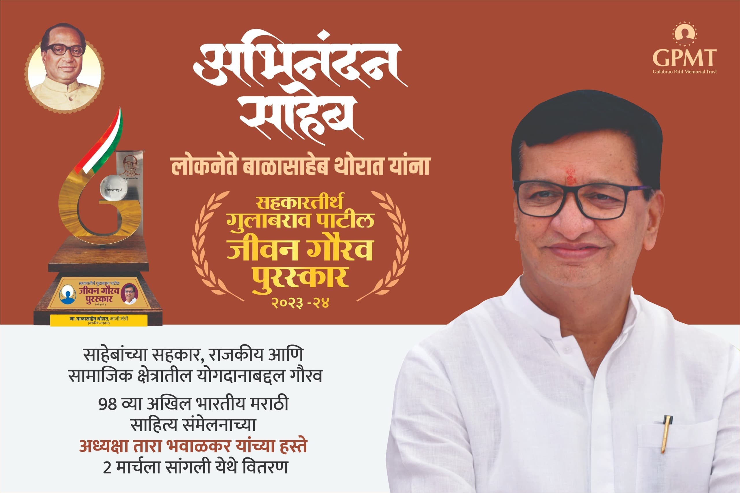 महाराष्ट्राचे वरिष्ठ नेते तथा यशवंतराव चव्हाण यांचे समृद्ध वारसदार म्हणून राज्यात ओळख असलेले सुसंस्कृत नेतृत्व बाळासाहेब थोरात यांना महाराष्ट्राच्या राजकीय, सामाजिक ,सहकार , शिक्षण व कृषी क्षेत्रातील उल्लेखनीय कामगिरीबद्दलचा यावर्षीचा अत्यंत प्रतिष्ठेचा सहकारतीर्थ गुलाबराव पाटील पुरस्कार जाहीर झाला आहे.