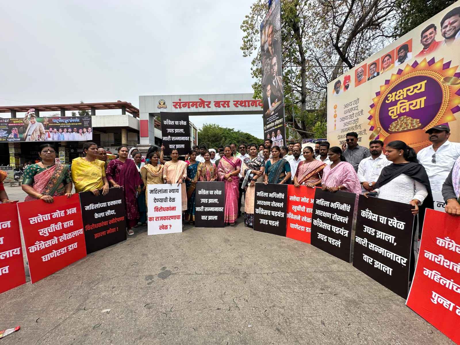 बसस्थानक परिसरात मोठ्या संख्येने महिला एकत्र आल्या होत्या. आंदोलनादरम्यान महिलांनी हातात फलक घेऊन “नारीशक्तीचा अपमान अजिबात सहन केला जाणार नाही” आणि “महिलांच्या हक्कांसाठी लढा देऊ” अशा घोषणा दिल्या. महिला सक्षमीकरणासाठी अत्यंत महत्त्वाचे मानले जाणारे हे विधेयक असून, त्याला विरोध करणे म्हणजे महिलांच्या प्रगतीला अडथळा आणण्याचा प्रयत्न असल्याचा आरोप सामाजिक कार्यकर्त्या नीलम खताळ, नगरसेविका साक्षी सूर्यवंशी आणि संगीता पुंड यांनी केला.
