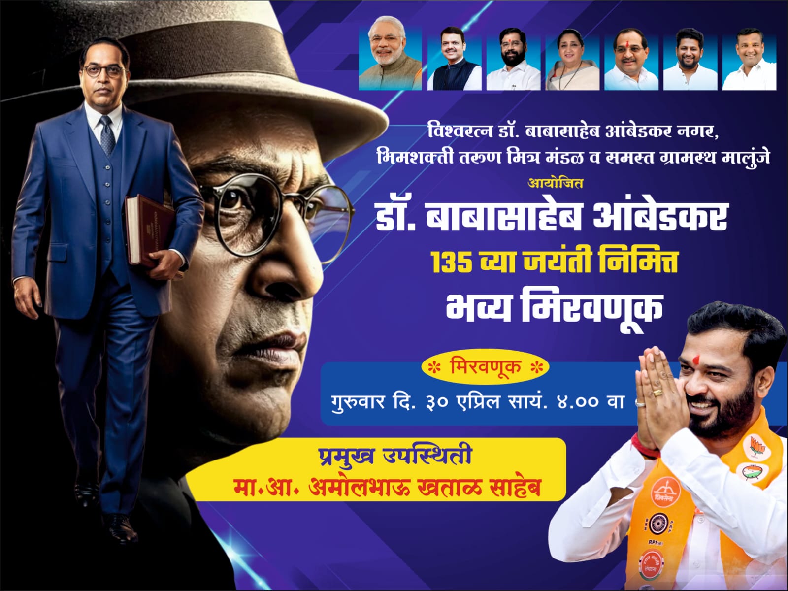 भारतीय राज्यघटनेचे शिल्पकार, विश्वरत्न डॉ. बाबासाहेब आंबेडकर यांच्या १३५ व्या जयंतीचे औचित्य साधून मालुंजे येथे भव्य उत्सवाचे आयोजन करण्यात आले आहे. ‘विश्वरत्न डॉ. बाबासाहेब आंबेडकर नगर’, ‘भिमशक्ती तरुण मित्र मंडळ’ आणि ‘समस्त ग्रामस्थ मालुंजे’ यांच्या संयुक्त विद्यमाने गुरुवार, दिनांक ३० एप्रिल रोजी सायंकाळी ४:०० वाजता ही भव्य मिरवणूक काढण्यात येणार आहे.