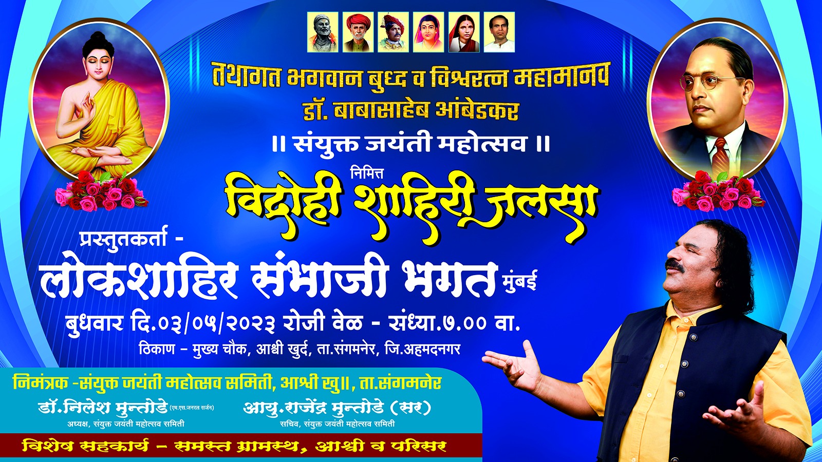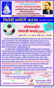 या विचाराला आधार बनवून सर्व स्तरातील समाज बांधवांमध्ये जागृती निर्माण करण्यासाठी प्रसिध्द लोकशाहीर संभाजी भगत यांच्या विद्रोही शाहिरी जलसा या कार्यक्रमाचे आयोजन केले आहे.