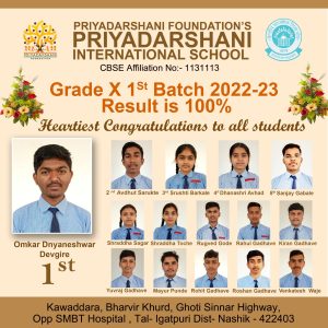 प्रियदर्शनी इंटरनॅशनल स्कूल, कवडदरा, भरविर खुर्द या CBSE मान्यता प्राप्त शाळेचा इयत्ता १० वी च्या प्रथम बॅचचा निकाल १००% टक्के लागला