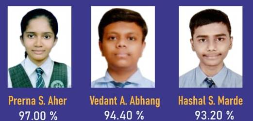 यावर्षी प्रेरणा सुदर्शन आहेर हिने 97% गुण मिळून प्रथम क्रमांक मिळवला आहे. तर वेदांत अंकुश अभंग यांनी 94.40% गुण मिळून दुसरा क्रमांक मिळवला आहे. हर्षल संतोष मरडे यांनी 93.20% गुण मिळून तिसरा क्रमांक मिळवला आहे.