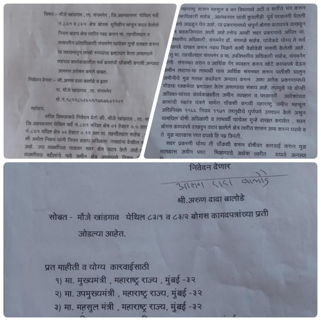 यासंदर्भात देण्यात आलेले निवेदनानुसार मौजे . खांडगाव, तालुका संगमनेर . जिल्हा अहमदनगर येथील सर्व्हे नं . 83 /1 मधील क्षेत्र 1 हेक्टर ० .5 आर व सर्व्हे नं .83 /2 मधील क्षेत्र 03 हेक्टर 0.12 आर .तत्कालीन मा. तहसिलदार साहेब संगमनेर श्री अमोल निकम यांनी नियमबाह्य अधिकार नसतांना देखील वाटप केले आहे ज्या व्यक्तींच्या नावावर सदर क्षेत्र वाटप केले आहे त्या दोन्ही व्यक्तींच्या वडिलांचे नावे जमीन क्षेत्र असल्याचे दिसून येते संबंधित व्यक्तींचे वडील हयात असून त्यांच्या जमिनीची वाटप अद्याप झालेली नाही सदर क्षेत्र वारस हक्काने या वाटप झालेल्या व्यक्तींनाच अविभक्त हिश्याने मिळणार आहे यावरून मा तहसिलदार संगमनेर यांनी बोगस कागदपत्राची कुठलीही तपासणी न करता सदर वाटपाचा आदेश केल्याचे दिसून येते यामध्ये मोठ्या प्रमाणावर आर्थिक गैरव्यवहार झाला आहे अशी आम्हाला खात्री वाटते या मध्ये मौजे खांडगाव येथील कामगार तलाठी व संगमनेर तहसील कार्यालयातील अव्वल कुळ कायदा कारकून तितकेच जबाबदार असून त्यांची योग्य ती चौकशी करून कायदेशीर कडक कारवाई करण्यात यावी. यासंदर्भात सर्व पुरावे विभागीय आयुक्त व जिल्हाधिकारी यांना दिले असून लाभार्थी यांनी बोगस कागदपत्रे दाखवून काही खरेदी विक्री एजंट यांना हाताशी धरून हा सगळा प्रकार केला असल्याचे दिसून येते.