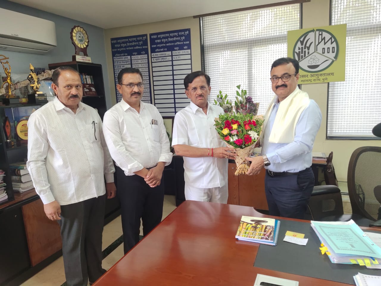 पुणे येथील साखर आयुक्त कार्यालयात थोरात सहकारी साखर कारखान्याचे कार्यकारी संचालक जगन्नाथ घुगरकर लेबर ऑफिसर ॲड .शरद गुंजाळ, पंडितराव शिंदे यांनी नवनियुक्त साखर आयुक्त चंद्रकांत पुलकंडावर यांचा सत्कार केला आहे.