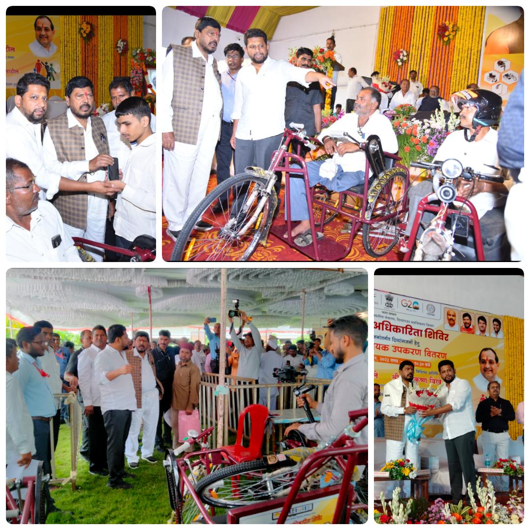 केंद्रीय आधिकारीता मंत्रालय आणि सामाजिक न्याय विभागाच्या माध्यमातून दिव्यांग व्यक्तिंना खासदार डॉ.सुजय विखे पाटील यांच्या माध्यमातून १ हजारांहून अधिक दिव्यांग व्यक्तिंना मंजुर झालेल्या साधन साहित्याचे मोफत वितरण मंत्री रामदास आठवले यांच्या उपस्थितीत करण्यात आले. यावेळी खासदार डॉ.सुजय विखे पाटील, खासदार सदाशिव लोखंडे, जिल्हाधिकारी सिध्दराम सालीमठ, जिल्हा परिषदेचे मुख्य कार्यकारी आधिकारी आशिष येरेकर, जिल्हा समाज कल्याण आधिकारी राधाकिसन देवडे, डॉ.अभिजित दिवटे, विजयराव वाकचौरे , बाळासाहेब गायकवाड, श्रीकांत भालेराव, सुरेंद्र थोरात, प्रकाश लोंढे, पप्पू बनसोडे , आशिष शेळके , भिमा बागुल , चांगदेव जगताप ,चद्रकांत सरोदे , राजेंद्र गवांदे आदी उपस्थित होते.