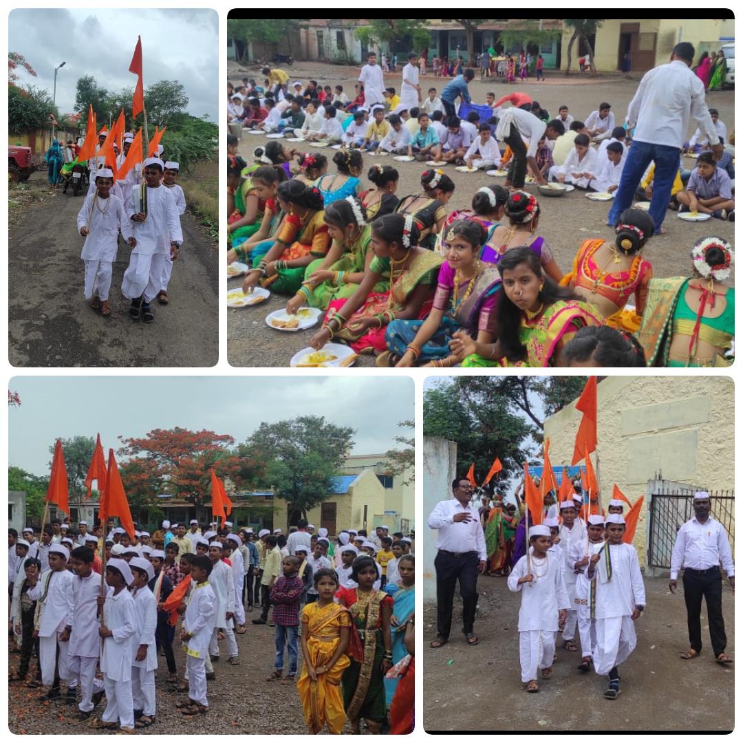 यावेळी शाळेतील मुला – मुलीनी वारकरी सांप्रदायातील वस्त्र अंगावर परिधान करत टाळ मृदंगाच्या गजरामध्ये हातामध्ये झेंडे घेऊन पांडुरंगाच्या हरिनामाचा गजर करत संपुर्ण गावातून पायी दिंडी काढली . यावेळी शाळेचे मुख्याध्यापक होडगर सर यांच्या मार्गदर्शनाखाली शाळेचे शिक्षक गजानन वाणी सर , मोरे सर , दिवटे सर , श्रीमती शिंदे , कर्मचारी शंकर जोशी व आप्पासाहेब वाघमारे मामा यांनी पायी दिंडीचे सुंदर असे नियोजन करून विद्यार्थ्यांना अभ्यासाबरोबर भक्ती , शक्ती मार्ग दाखविला .