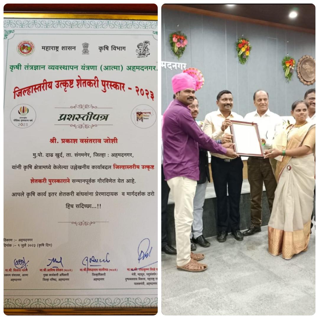 संगमनेर तालुक्यातील दाढ खुर्द येथील शेतीसह पुरक व्यवसायाला चालना देणारे युवा शेतकरी प्रकाश वसंतराव जोशी यांना सेंद्रीय शेतीसह गट शेतीला प्राधान्य देत कांदा पिकांचे उच्चांक केला पुरक व्यवसाय म्हणून मुक्तसंचार गोठा स साकारला तर केलेल्या उल्लेखनीय कामगिरीबद्दल कृषी विभागाच्या वतीने जिल्ह्यातील उत्कृष्ट शेतकरी हा पुरस्कार देऊन जिल्हा कृषी अधिकारी सुधाकर बोराळे यांच्या हस्ते सन्मानित करण्यात आले. यावेळी कृषी विभागाचे अधिकारी, कर्मचारी शेतकरी उपस्थित होते.