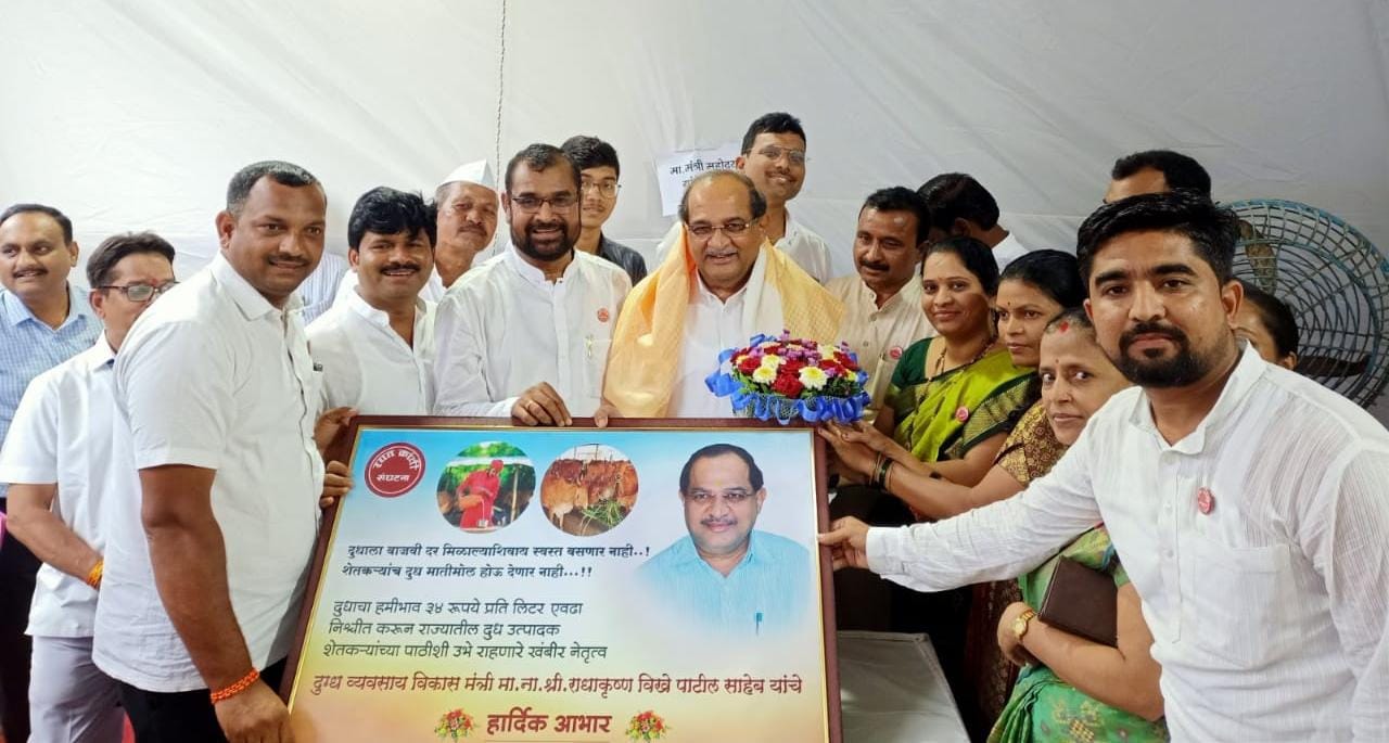 राज्यात दूधाला किमान भाव मिळावा, दूधाच्या खरेदी दरात कपात होऊन दूध उत्पादक शेतकऱ्यांना आर्थिक नुकसान होऊ नये या उद्देशाने गायीच्या दूधाला प्रतिलिटर किमान ३४ रूपये भाव देण्याचा महत्वपूर्ण आणि शेतकरी हिताचा निर्णय शासनाने घेतल्याबद्दल रयत क्रांती संघटनेच्यावतीने आज विधिमंडळ प्रांगणात सत्कार करण्यात आला. यावेळी शाल पुष्पगुच्छ आणि आभारपत्राची फ्रेम भेट देण्यात आली. पशुसंवर्धन व दुग्ध व्यवसाय विकास विभागात विखे पाटील यांनी घेतलेल्या विविध निर्णयाबद्दल स्तुती केली. तसेच शेतकऱ्यांच्यावतीने त्यांचे आभार मानले.