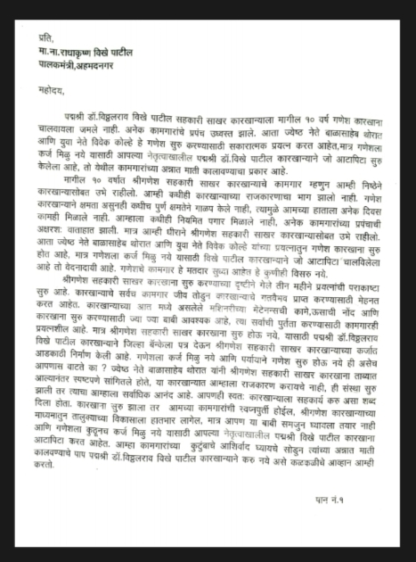 प्रसिद्धीस दिलेल्या या पत्रकात म्हटले आहे की, ‘मागील दहा वर्षात श्री गणेश सहकारी साखर कारखान्याचे कामगार म्हणून आम्ही निष्ठेने कारखान्यासोबत उभे राहिलो. आम्ही कधीही कारखान्याच्या राजकारणाचा भाग झालो नाही. गणेश कारखान्याने क्षमता असूनही कधीच पूर्ण क्षमतेने गाळप केले नाही, त्यामुळे आमच्या हाताला अनेक दिवस कामही मिळाले नाही. आम्हाला कधीही नियमित पगार मिळाले नाही, अनेक कामगारांच्या प्रपंचाची अक्षरशः वाताहात झाली. मात्र आम्ही धीराने श्री गणेश सहकारी साखर कारखान्यासोबत उभे राहिलो. आता ज्येष्ठ नेते बाळासाहेब थोरात आणि युवा नेते विवेक कोल्हे यांच्या प्रयत्नातून गणेश कारखाना सुरू होत आहे, मात्र गणेशला कर्ज मिळू नये, यासाठी विखे पाटील कारखान्याने जो आटापिटा चालवलेला आहे तो वेदनादायी आहे. गणेश चे कामगार हे मतदार सुद्धा आहेत, असाही इशारा या पत्रात देण्यात आला आहे.