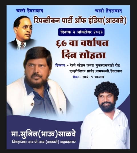 ३ आक्टोबर २०२३ ला रिपब्लिकन पक्षाचा ६७ वा वर्धापन असल्याने या पक्षाचे अधिवेशन तेलंगणातील हैदराबाद येथील नामपल्ली रेल्वे स्टेशन जवळील मुकररामजाही रोडवरील एक्शिबिशन ग्रांऊड वर होणार असून नगर जिल्ह्यातून हजारोंच्या संख्येने कार्यकर्त्यानी या अधिवेशात सहभागी व्हावे असे आवाहन जिल्हाध्यक्ष सुनिल साळवे यांनी केले आहे