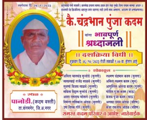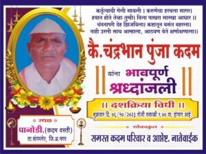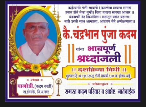 कै चंद्रभान कदम यांचे बुधवार दि २७ सप्टेबर २०२३ रोजी हदय विकाराच्या झटक्याने दुःखद निधन झाले . त्याच्या दशक्रिया विधी शुक्रवारी ०६ आक्टोबर २०२३ रोजी पानोडी येथील कदम वस्तीवर होणार आहे