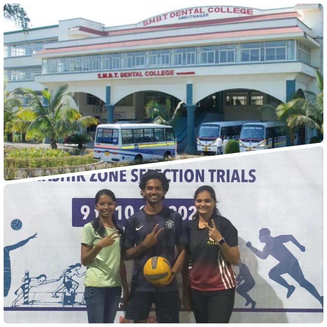 याबाबत अधिक माहिती देताना डॉ पाटील म्हणाले की, एसएमबीटी दंत महाविद्यालयाच्या माध्यमातून सातत्याने सामाजिक उपक्रम राबवले जात आहेत .उच्च वैद्यकीय शिक्षणाबरोबर विद्यार्थ्यांचा सर्वांगीण विकास व्हावा यासाठी ही महाविद्यालय सर्व विभागीय स्तरावर उपक्रमांमधून सहभाग नोंदवला जात आहे .नाशिक येथे झालेल्या विभागीय हॉलीबॉल स्पर्धेमधून एसएमबीटी दंत महाविद्यालयाच्या कल्पेश नवले, समृद्धी वाणी व कोमल राक्षे या तीन विद्यार्थ्यांची जळगाव येथील शासकीय होमिओपॅथिक मेडिकल कॉलेज येथे होणाऱ्या अंतर विभागीय हॉलीबॉल स्पर्धेसाठी निवड झाली आहे. या विद्यार्थ्यांना प्रशासकीय अधिकारी डॉ सुयोग साखरे व क्रीडा संचालक प्रा पंकज जाधव यांचे मार्गदर्शन लाभले .