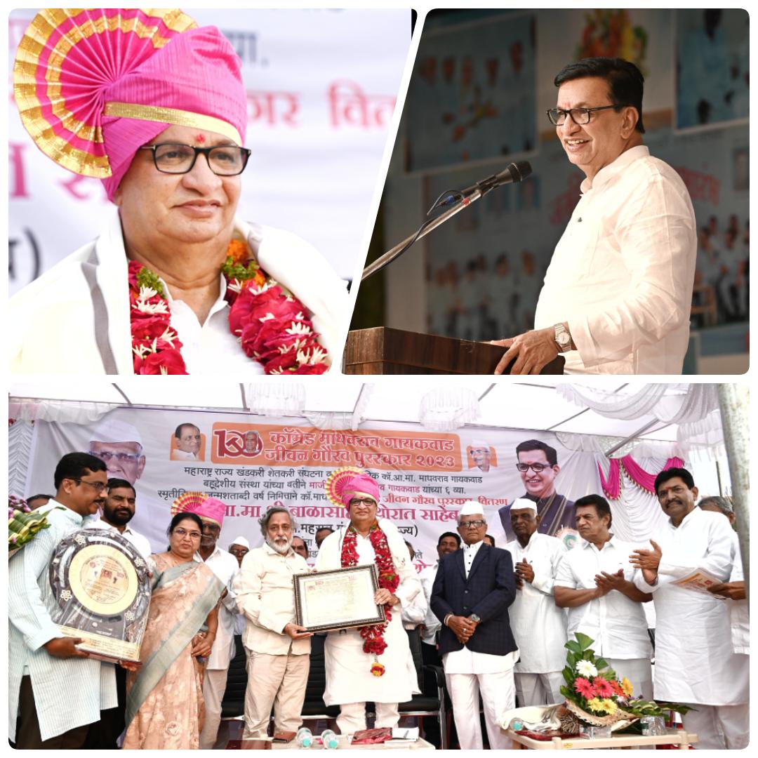 सातत्याने 52 वर्षे खंडकरी शेतकऱ्यांची चळवळ उभारून काम करत त्यांना न्याय देण्याचे काम करणारे कॉम्रेड स्वर्गीय माधवराव गायकवाड यांच्या विचारांचा वारसा जपत खंडकरी शेतकऱ्यांसाठी महसूलमंत्री पदाच्या काळात अत्यंत चांगली योजना राबवून या शेतकऱ्यांच्या जीवनात आनंद निर्माण करणारे लोकनेते आमदार बाळासाहेब थोरात यांना कॉम्रेड माधवराव गायकवाड जीवनगौरव पुरस्काराने सन्मानित करण्यात आले आहे.