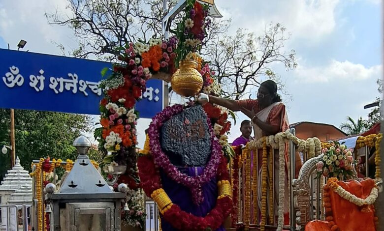 महामहिम राष्ट्रपती द्रौपदी मुर्मू यांनी आज शनिशिंगणापूर येथे श्री शनैश्वर मूर्तीचे दर्शन घेत मनोभावे पुजा केली. यावेळी राष्ट्रपतींनी श्री शनैश्वर मूर्तीस तैलाभिषेकही केला.