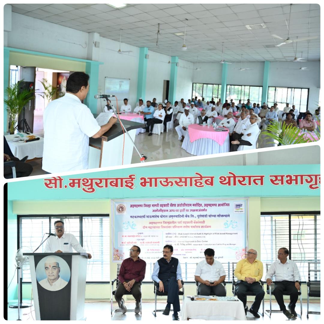 अहमदनगर जिल्हा नागरी सहकारी बँक असोसिएशन व सहकारमहर्षी भाऊसाहेब थोरात अमृतवाहिनी सहकारी बँक यांच्या संयुक्त विद्यमाने असोसिएशन आपल्या दारी या उपक्रमांतर्गत आयोजित प्रशिक्षण शिबिराचे बोलत होते.” यावेळी प्रशिक्षक सीए अभय भाटे , उद्योजक राजेश मालपाणी, असोसिएशनचे अध्यक्ष गिरीशजी घैसास ,बँकेचे चेअरमन सुधाकर जोशी व संचालक तसेच अहमदनगर जिल्ह्यातून आलेले सर्व सहकारी बँकांचे चेअरमन ,व्हाईस चेअरमन, संचालक, सीईओ, आधी उपस्थित होते.