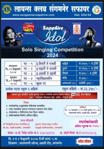 लायन्स क्लब संगमनेर सफायर यांच्यातर्फे मंगळवार दि. १ फेब्रुवारी २०२४ व बुधवार दि. २ फेब्रुवारी २०२४ रोजी सायंकाळी ५ वाजता. सफायर आयडल गायन स्पर्धेचे आयोजन मालपाणी लाॅन्स, लक्ष्मी रोड, संगमनेर येथे केले आहे.
