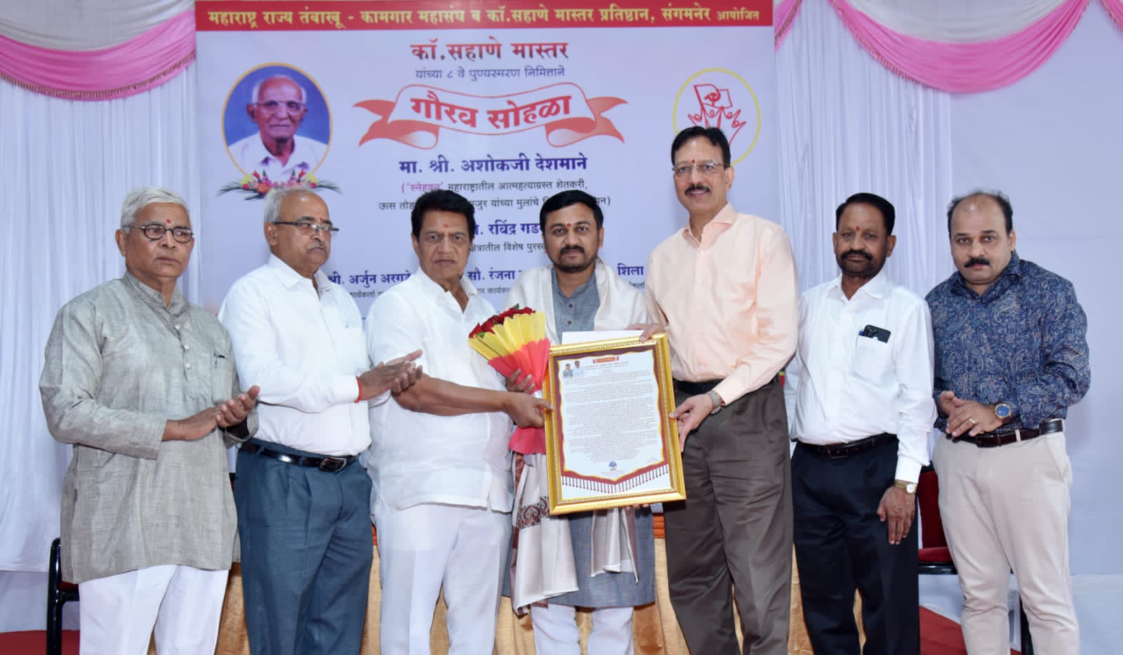 व्यासपीठावर मालपाणी उद्योग समूहाचे सर्वेसर्वा राजेशजी मालपाणी, विषेश समाजसेवा पुरस्कार्थी अशोक देशमाने, कामगार युनियनचे अध्यक्ष काॅ. माधवराव नेहे, संघटनेचे सरचिटणीस कॉ. ॲड ज्ञानदेव सहाणे, काॅ. सहाणे मास्तर प्रतिष्ठान चे अध्यक्ष काॅ. सुभाष कडलग विराजमान होते.