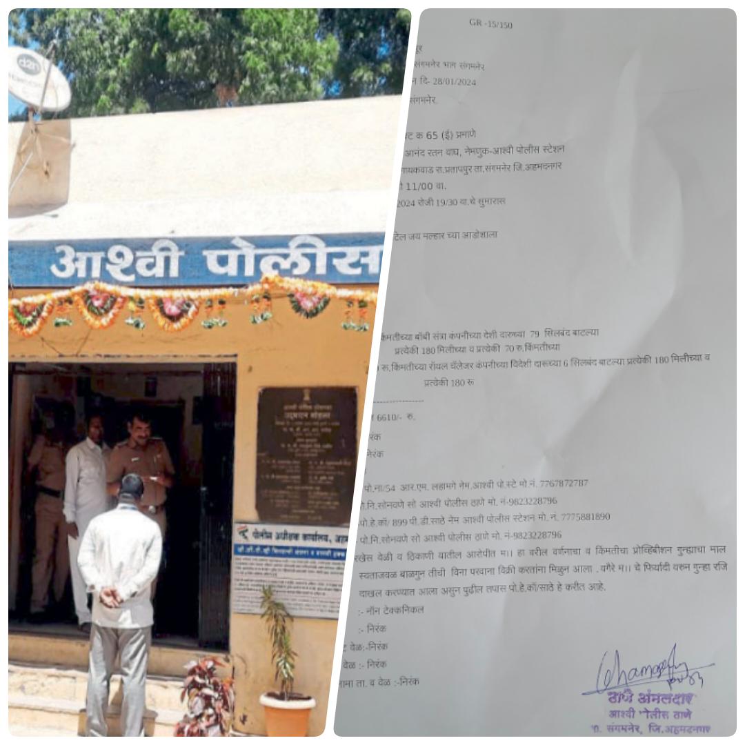 याबाबत हवालदार आनंद रतन वाघ यांनी आश्वी पोलीस ठाण्यात फिर्याद दिली असून त्यावरुन गुन्हा रजिस्टर नंबर 22/ 2024 मु. प्रो अॅक्ट 65 (ई) प्रमाणे गुन्हा दाखल करण्यात आला आहे. जप्त करण्यात आलेल्या अवैध दारु विक्रीच्या बाटल्यांमध्ये 1080 रुपये किंमतीच्या रॉयल चॅलेज कंपनीच्या 180 मिलीच्या प्रत्येकी एकशे ऐंशी रुपये किंमतीच्या 6 सिलबंद बाटल्या , 5530 रुपये किंमतीच्या प्रत्येकी सत्तर रुपये किंमतीच्या देशीच्या 79 सिलबंद बाटल्या अशा एकूण 6 हजार 610 रुपये किमतीच्या 85 बाटल्या जप्त करण्यात आल्या असून पो नि संजय सोनवणे यांच्या नेतृत्वाखाली पो कॉ पी डी साठे हे तपास करत आहे .